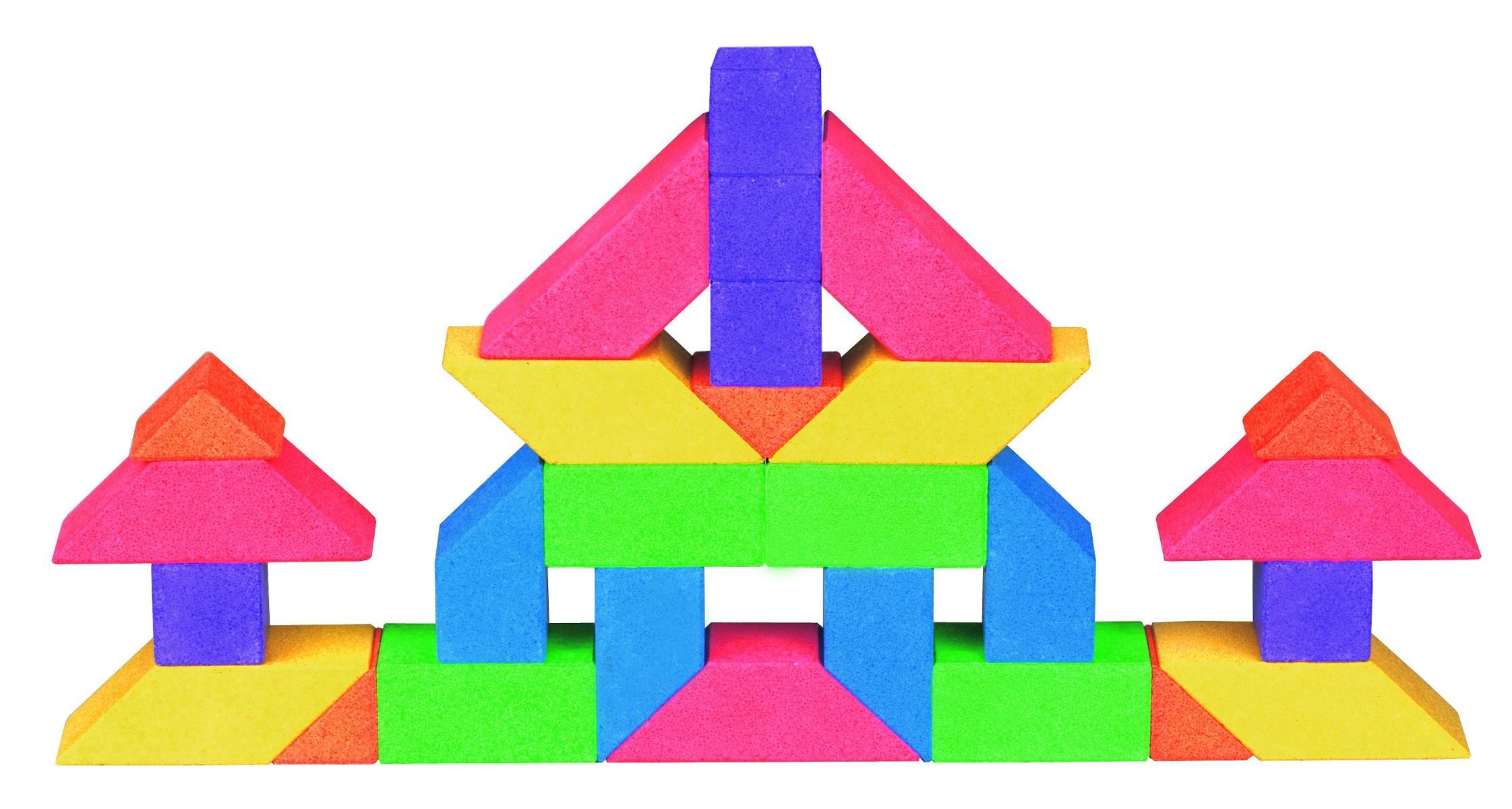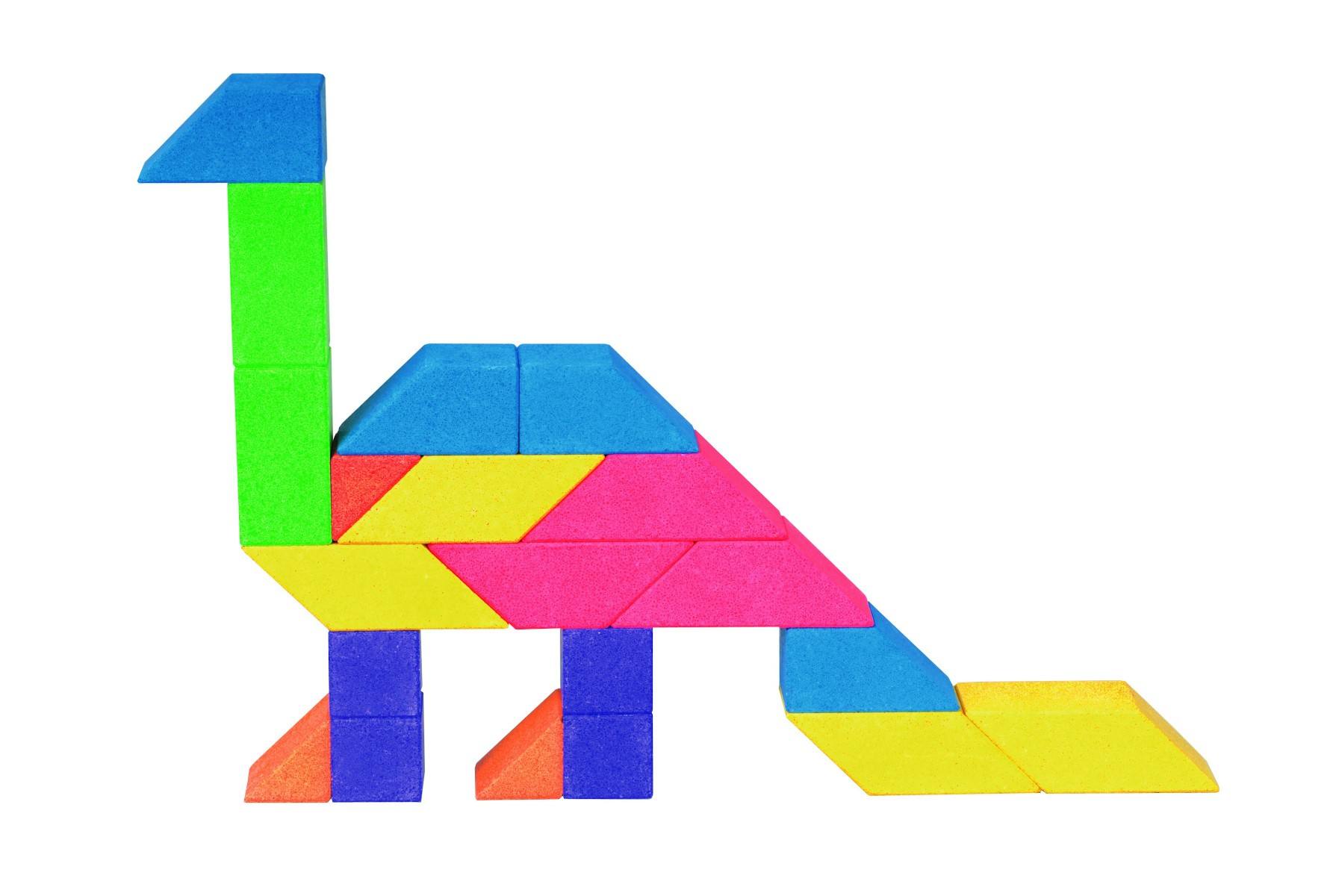 Ein Mitspieler zieht eine Karte und hat eine Minute Zeit, das abgebildete Objekt mit diesen Steinen zu bauen, Farben spielen keine Rolle, Formen sind wichtig.