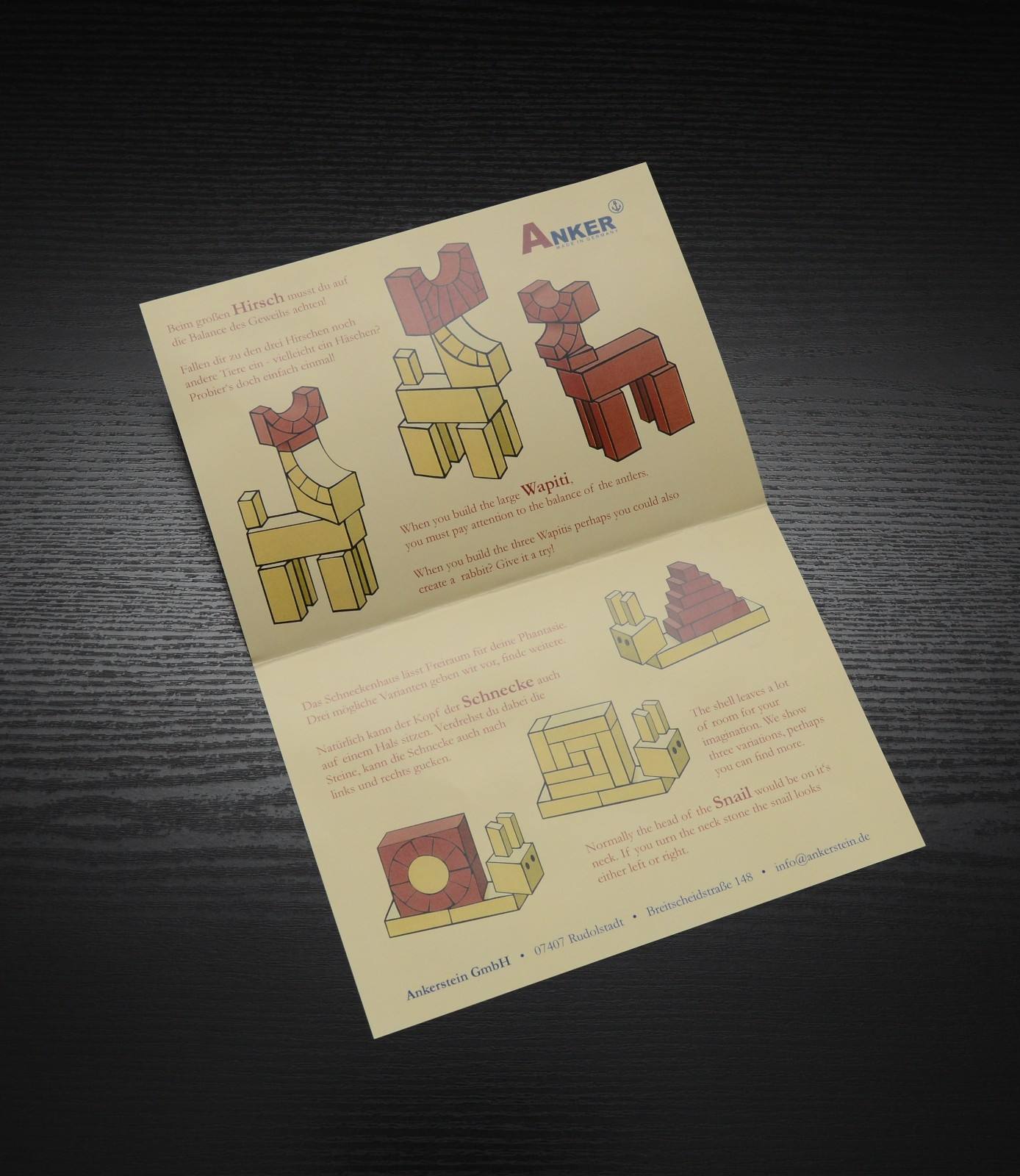 Der Sonderkasten „Tiere und mehr" setzt der Fantasie keine Grenzen. Ob Katze und Maus, Hunde, Schnecken, Elche oder Fabelwesen, viele Tiere lassen sich mit den 58 Steinen in den traditionellen Ankersteinfarben gelb (Sandstein), rot (Ziegel) und blau (Schiefer) bauen. Die Bauvorlage zeigt eine kleine Auswahl an Tieren, viele weitere Tiere sind möglich.