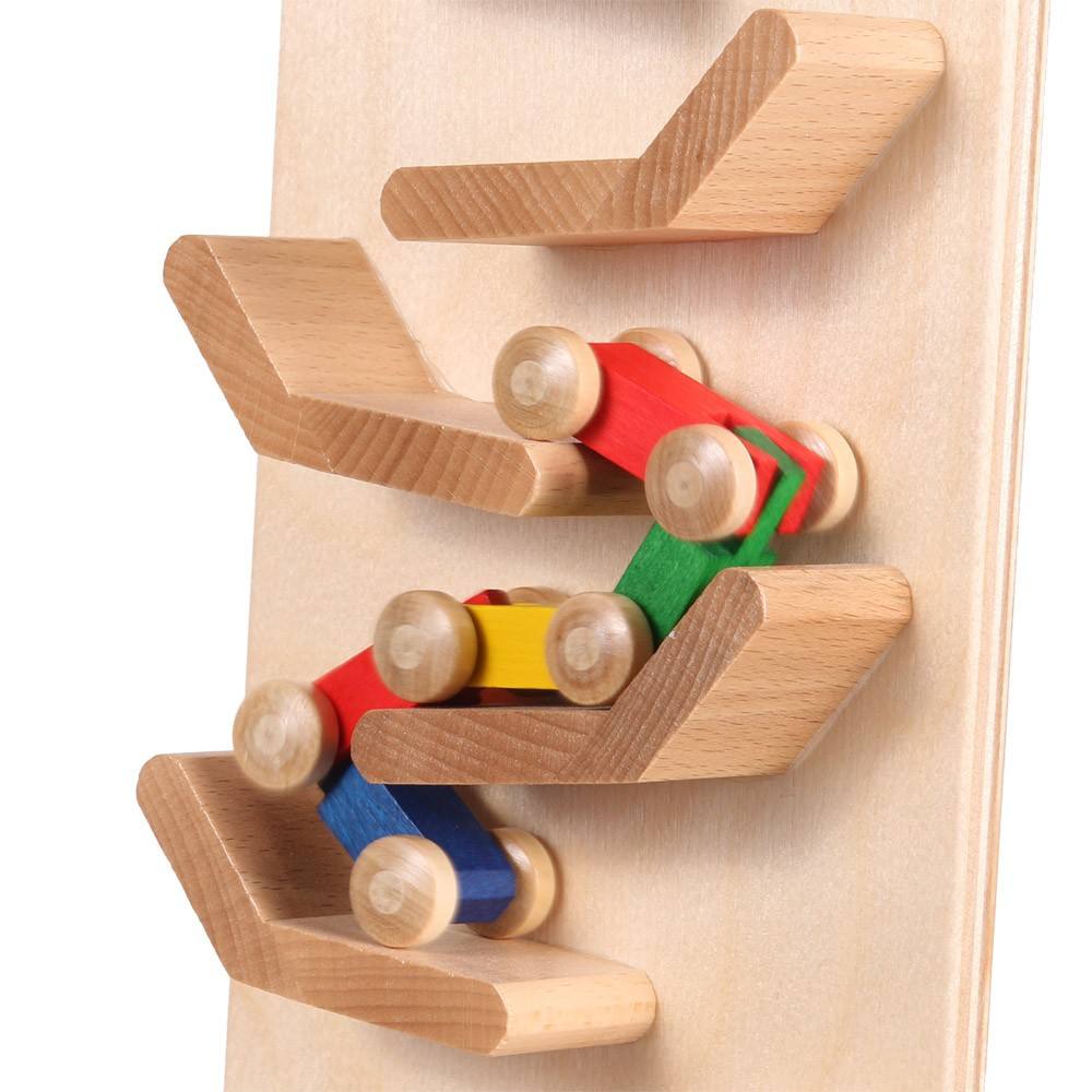 Der Turm ist 110 cm hoch. Die Wand und die Fahrbahn sind naturlackiert und der Tausendfüssler ist bunt gebeizt. Der Kaskadenturm ist mit spiel gut ausgezeichnet. Das Produkt ist ein Design der Firma Beck Spielwaren.