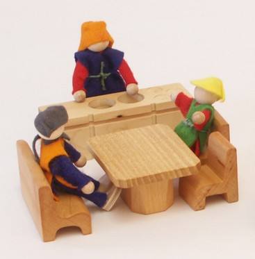 Dabei handelt es sich um des Möbelset bestehend aus Tisch, Bank, 2 Stühlen und einer kleinen Küchenzeile Herd-Spüle-Kühlschrank. Insgesamt sind 5 Möbelteile enthalten.