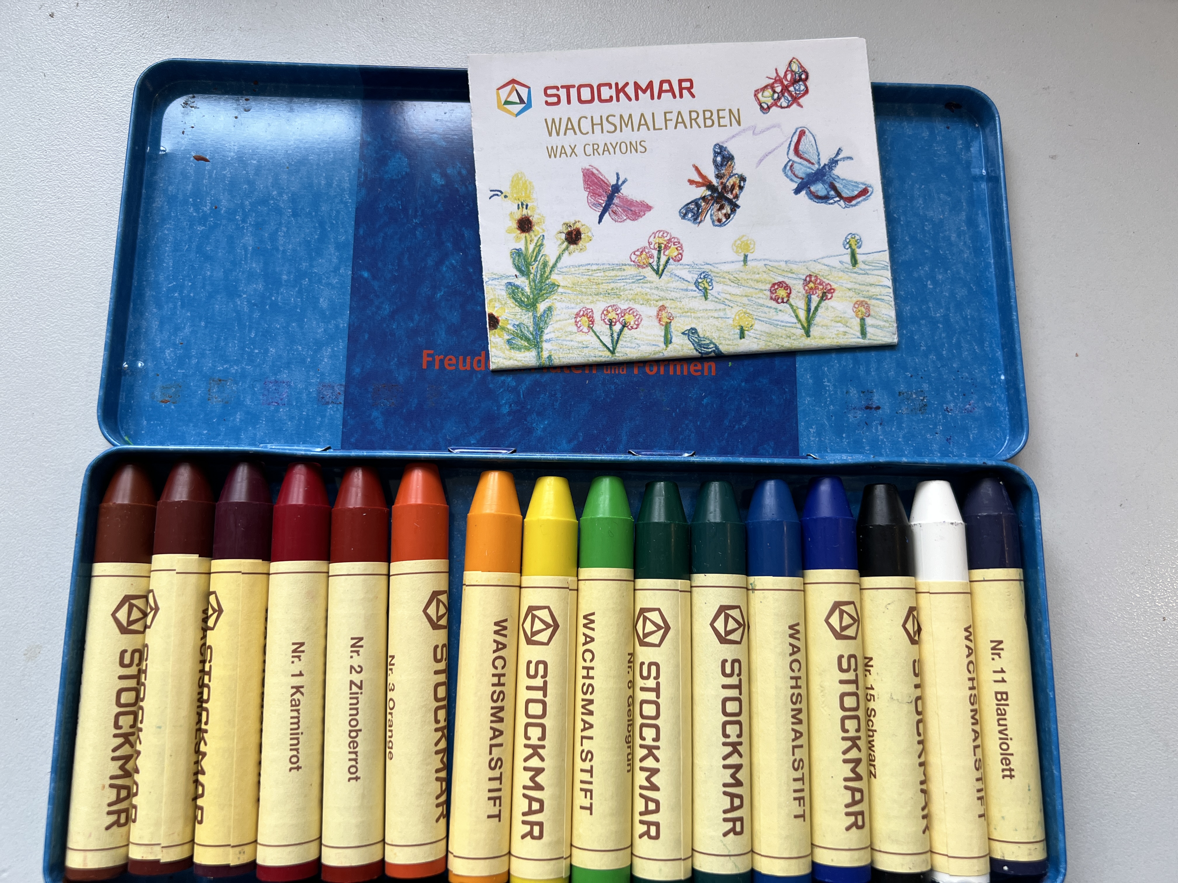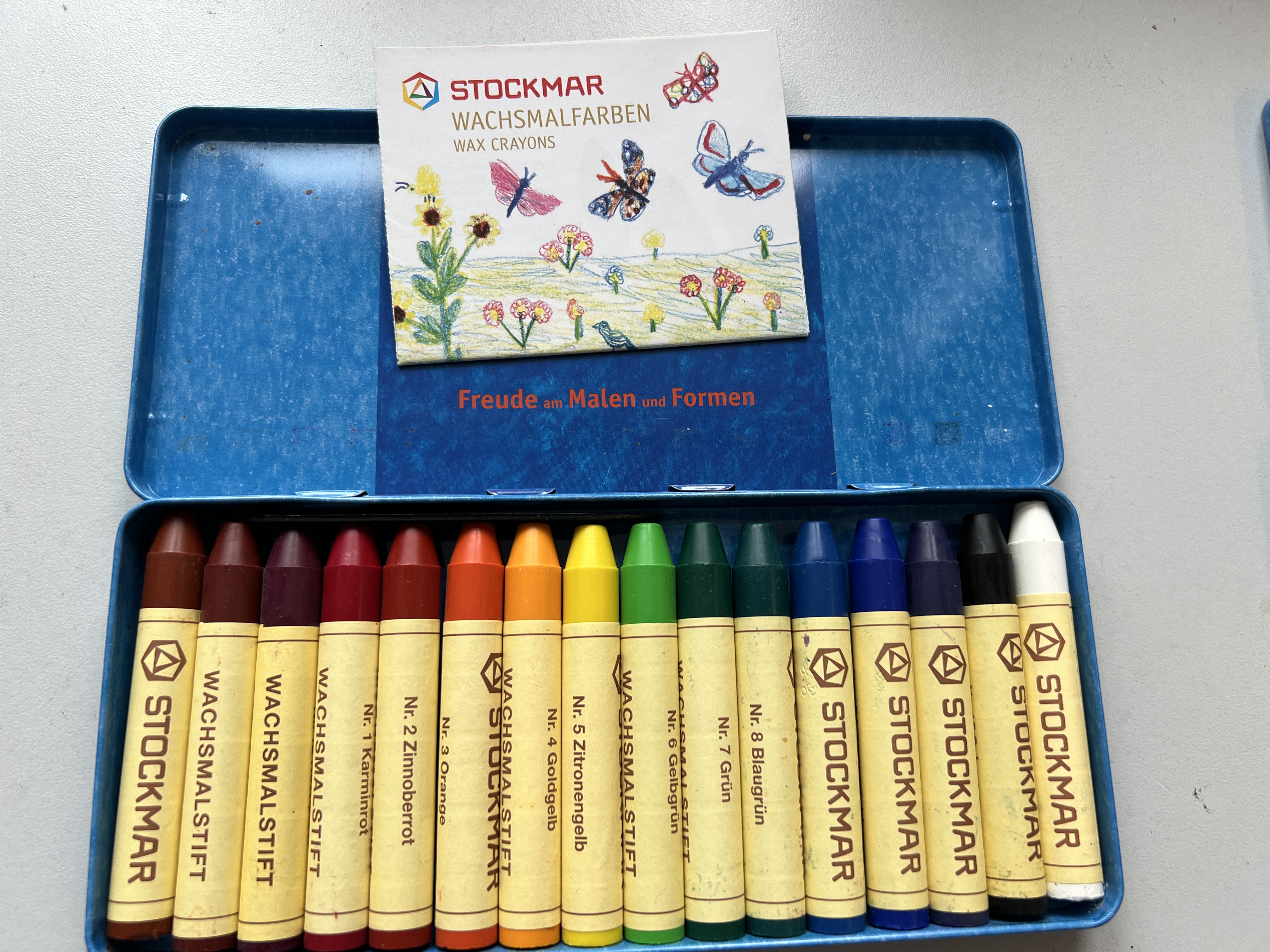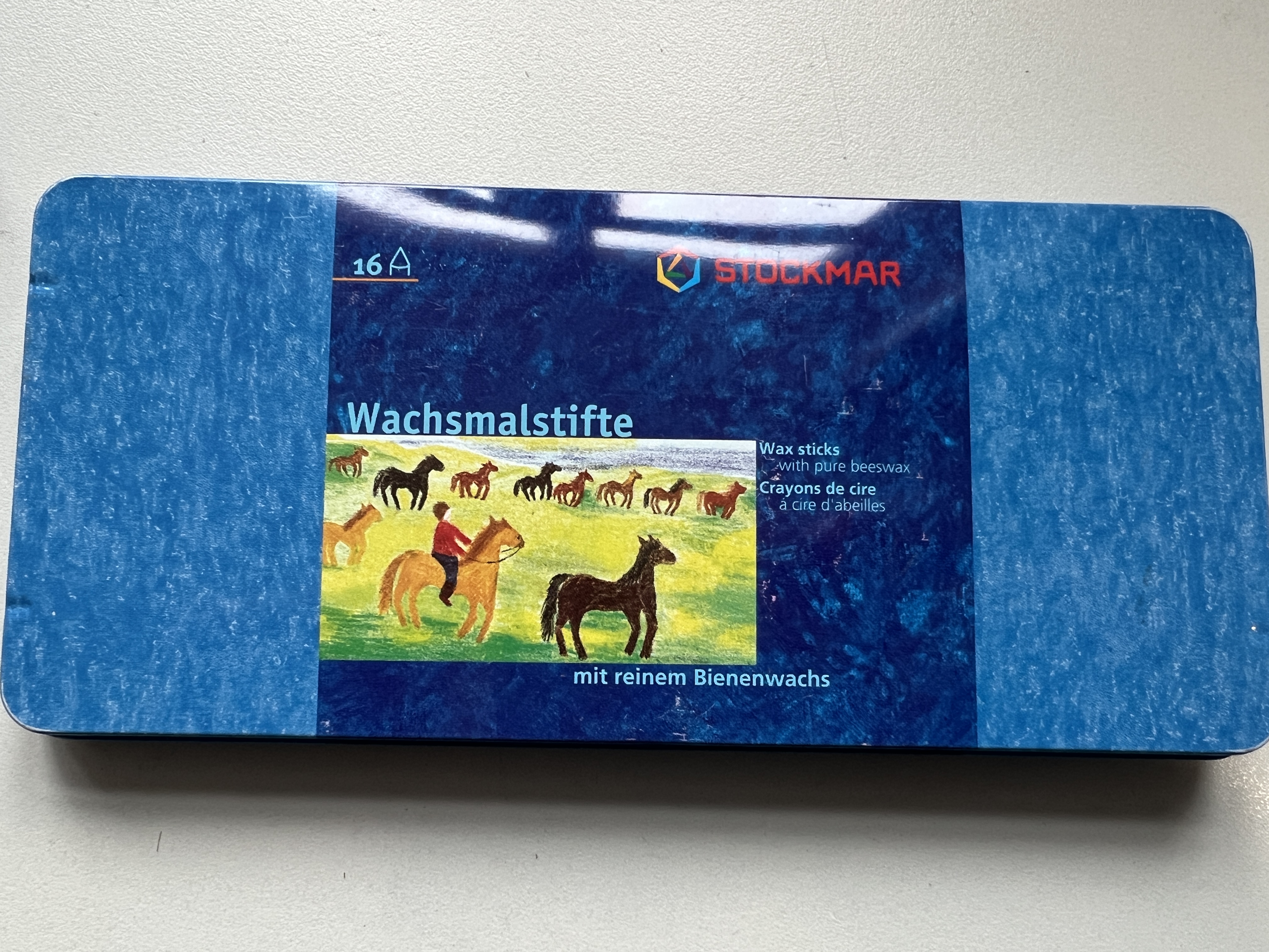 Es handelt sich um den Artikel STOCKMAR Wachsmalstifte 16 Farben - BWare aus Retouren - vor allem Kratzer/Abnutzungen am Blechetui.