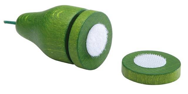Es handelt sich um eine schöne grüne Holzgurke für den Erzi Kaufladen. Die Gurke besteht aus 3 Teilen, welche sich mittels Klettverschluss verbinden oder schneiden lassen.