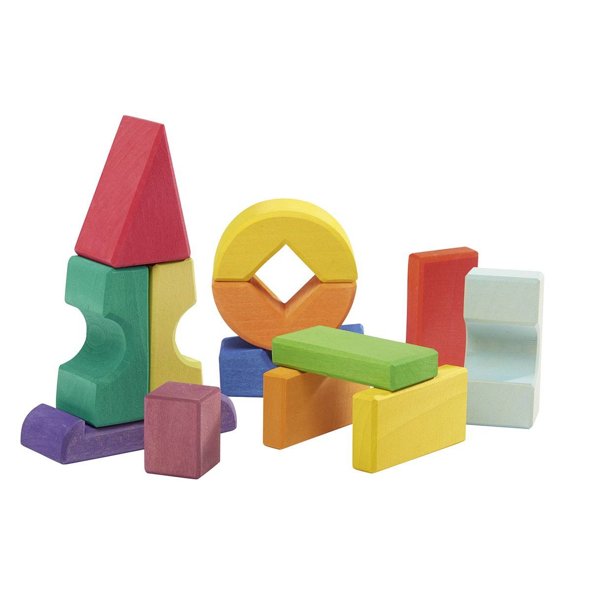 Bunt, kreativ, fantasievoll. Die Formen sind aus hochwertigem Lindenholz hergestellt und ergeben eine besondere Haptik durch die gebeizten Oberflächen. Freie Bauweisen in allen möglichen Traumwelten lassen Kinder und Eltern zu individuellen Baumeistern werden.