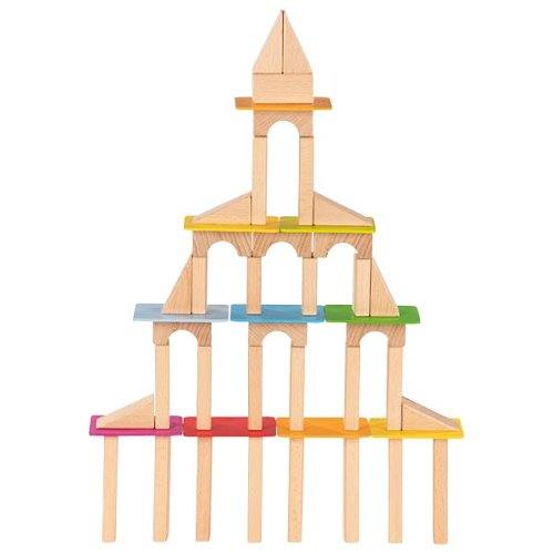 Eine Kombination aus klassischem Massivholzsteinen und unterschiedlichen lasierten Kartenformen sorgt für vielfältige Bau- und Kombinationsmöglichkeiten. Die hochwertig lasierten Holzkarten vervielfachen die Konstruktionsmöglichkeiten und verleihen jungen Baumeistern einen Kreativschub. Unzählige Möglichkeiten lassen kleinen Konstrukteuren alle Optionen offen, kreativ zu sein und sich immer neuen architektonischen Herausforderungen zu stellen. Und mit 100 Teilen lassen sich eine ganze Menge an Ideen umsetzen.
