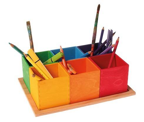 Sortierspiel und Aufbewahrung für alle sechsfarbigen Regenbogen Artikel von GRIMMs. die Kinder können hier beispielsweise die Holzkugeln (10238, 10239) und die Figuren von dem Sortierspiel Regenbogen (42125) einsortieren. Natürlich finden in den Kistchen auch Holzperlen, Stifte oder andere kleine Dinge und Schätze ihren Platz. Außerdem können hier auch Pinsel, Schere, Kleber, Lineal und vieles mehr sortiert, aufgeräumt und gesammelt werden.