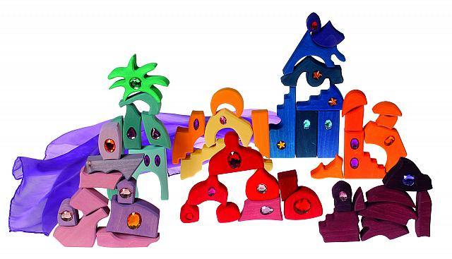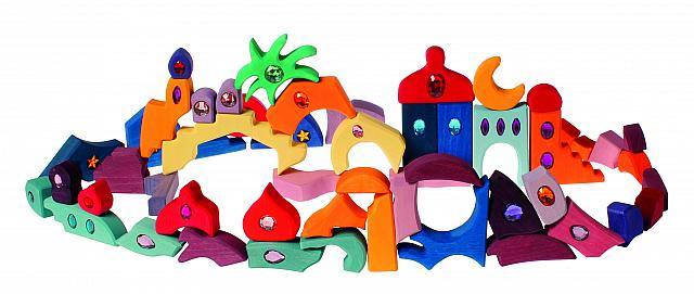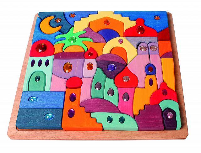 Hier kommt es nicht darauf an, das Legespiel wieder richtig zusammen zu setzen. Vielmehr geht es darum, gemeinsam zu entdecken, was noch alles daraus entstehen kann. Mit den Klötzchen vom Morgenland kann man bezaubernde Bilder legen und bauen: glitzernde Paläste, Burgen, Schiffe und vieles mehr entstehen durch die Phantasie der Kinder.