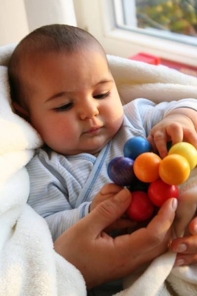 Dies ist ein Greifling welcher aus 12 Holzkugeln im Durchmesser von 3cm besteht. Als Holzart wird Buche oder Ahorn verwendet. Das Holz ist farblich lasiert. Der Greifling hat einen Durchmesser von 11 cm.