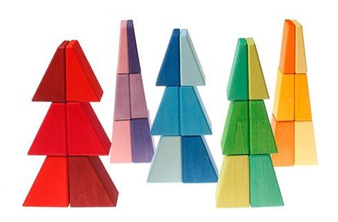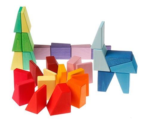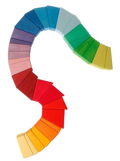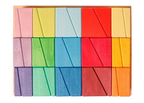 Ein kniffliges Bauspiel mit unterschiedlich schiefen Steinen. Nur die farblich passenden Steine lassen sich paarweise zum Rechteck ergänzen. Die Bauklötze einer Farbfamilie (blau/rot/grün/gelb und lila) haben den jeweils gleichen Neigungswinkel und können miteinander auch zum Rechteck ergänzt werden. Beim Bauen und Spielen werden ganz nebenbei die Feinmotorik und das räumliche Denken der Kinder geschult.