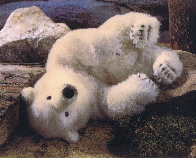 Nach dem Baden wälzt er sich genüsslich im Sand. Sein weißes Fell färbt sich dadurch dunkel, so dass er oft mit einem Braunbären verwechselt wird. Um dies naturnah darzustellen, erhält dieser Kösen Eisbär aus wertvollen Alpaka-Webpelz einen braunen Schimmer.