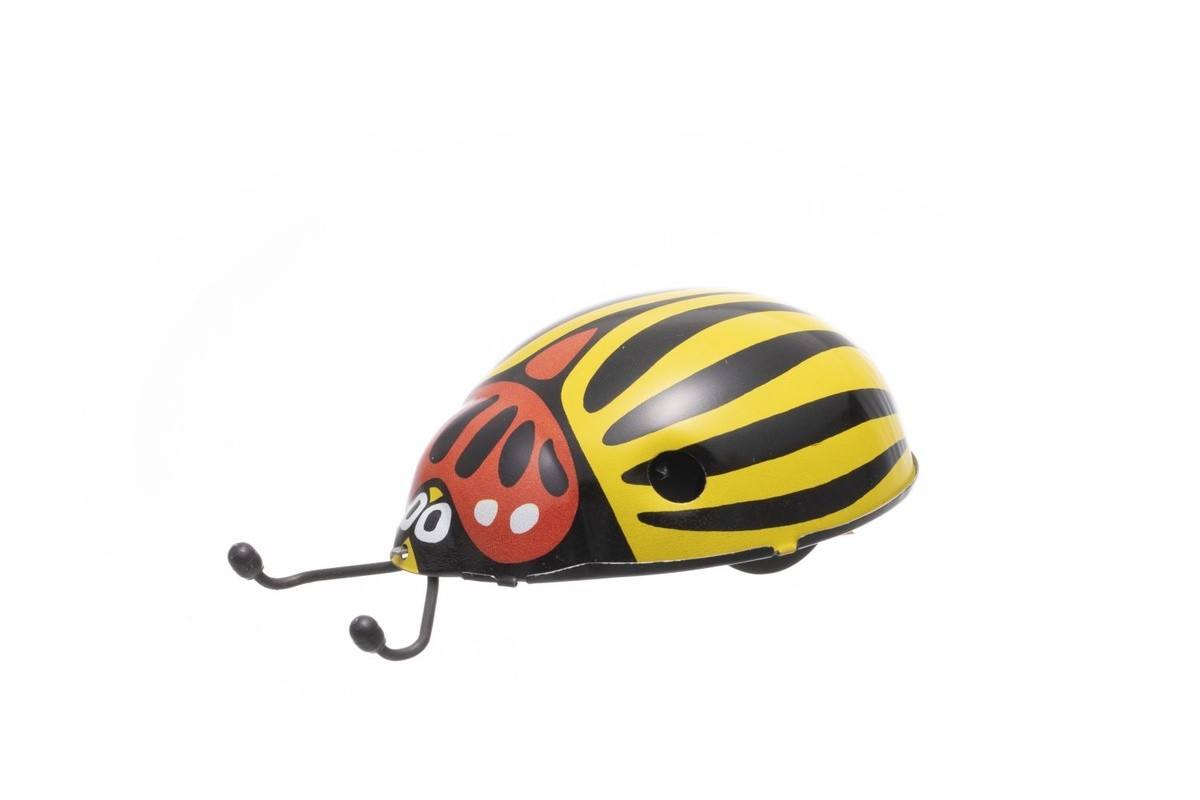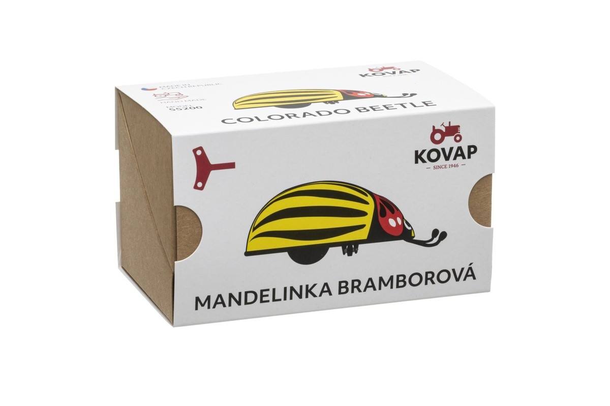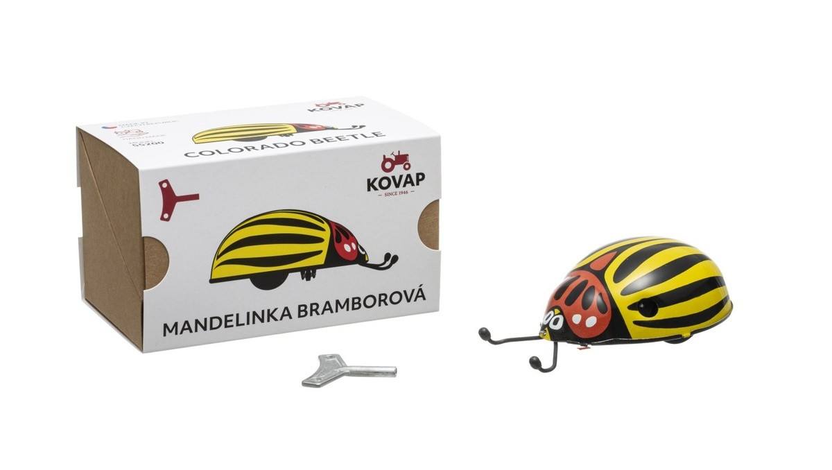 Der KOVAP Kartoffelkäfer ist ein mechanisches Blechspielzeug mit Federwerkantrieb zum Aufziehen. Ein Drehmechanismus verhindert das Herunterfallen vom Tisch, in dem das Spielzeug die Fahrtrichtung ändert.