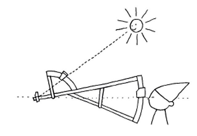 Mit dem Rücken zur Sonne gleicht man das Visier mit dem Horizont ab. Dann gleicht man den kleinen Bogen so an, dass er den Schatten der Sonne genau auf die Linie des Horizontes abildet. Die Winkel der beiden Ansichten ergeben zusammen den aktuellen Stand der Sonne.