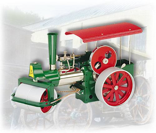 Wilesco D 305 Dampf-Feuerwehrauto Wilesco 00365 D 365 Dampfwalze Old Smoky, grün Bedienungsanleitung auf: YouTube Wilesco Dampfmaschinen, mobile Es handelt sich um den Artikel Wilesco D 305 Dampf-Feuerwehrauto. Das Original zu dieser voll funktionsfähigen Dampfspritze wurde um 1900 in Deutschland von Magirus hergestellt. Der Antrieb erfolgt über die Dampfmaschine. Das Feuerwehrauto kann vor- und rückwärts fahren. Über das Dampfabsperrventil wird die Geschwindigkeit geregelt. Weitere Details: Hochglanzpolierter Messingkessel 80 mm Durchmesser, Länge 150 mm, Kesselinhalt 450 cm³, mit Wasserstandsanzeiger, mit einem durch den Kessel geführten Flammrohr 20 mm Durchmesser zur besseren Wärmeausnutzung und Ableitung des Rauches, Sicherheitskaminaufsatz. Stehender, doppelt wirkender Messingzylinder, mit einem in beide Drehrichtungen anwerfbaren Schwungrad, 80 mm Durchmesser. Federsicherheitsventil, Dampfpfeife mit Kettenzug, Auffangbehälter für Kondenswasser, Dampfstrahlöler und Dampfabsperrventil, Gussräder mit Vollgummireifen, Sitzbänke, Alarmglocke, zwei lackierte Gusslampen, Lenkrad für die Vorderräder. Auskuppelbares Zahnradgetriebe mit Kettenantrieb auf die Hinterachse. Im stationären Dampfbetrieb kann die selbstansaugende Wasserpumpe über den Kupplungshebel in Betrieb gesetzt werden. Wasservorratsbehälter unter der vorderen Sitzbank, mit Schlauchverbindung zur Pumpe, spritzt 2 - 3 m weit. Zwei abnehmbare Haspeln mit je 800 mm Schlauch zum Anschließen an die Pumpe, mit Kupplung und Spritzdüse. Das Modell ist rot und schwarz lackiert bzw. aus Messing. Laufzeit ca. 15 Minuten.