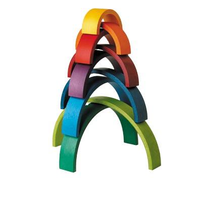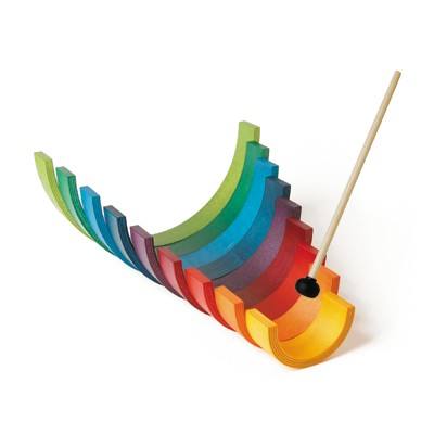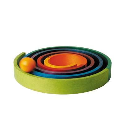 Farbe, Form, Klang - neun Bogenelemente aus Ahornschichtholz sind Spielobjekt und Klangkörper zugleich. Brilliante Regenbogenfarbtöne und das hochwertig verarbeitetete Holz machen Rainbow zu einem Spiel- und Kunstobjekt mit grosser haptischer Qualität. Virtuos die Balance finden, schwer ist es nicht, denn es gibt viel zu entdecken. Leuchtkraft und Schlichtheit der Bogenelemente verführen immer wieder dazu, Farben und Klänge neu miteinander zu kombinieren und die Kugel rollt auf der Regenbogenbahn.