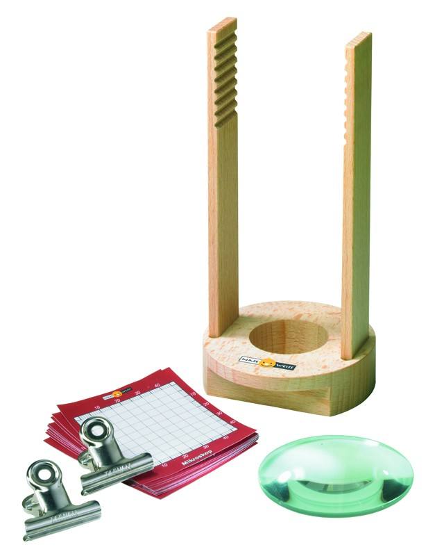 Kinder haben die Augen noch dicht am Boden oder am Microskop. Jetzt werden Pflanzen, Insekten und kleine Schätze groß. Das NASEWEISS Microskop besteht aus einem Halter, in den eine Glaslinse eingesteckt wird. Dazu gibt es zehn Objektträger aus Papier, zwei Halteklammern und eine Anleitung mit Tipps für Entdecker. Das Loch im Sockel ermöglicht auch die Durchleuchtung von Objekten.