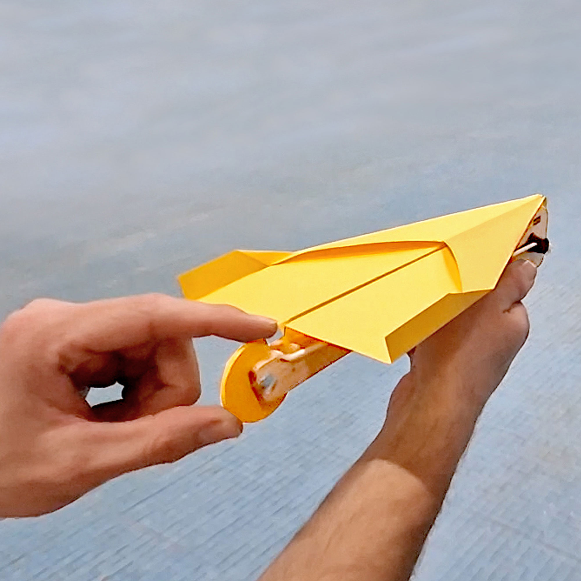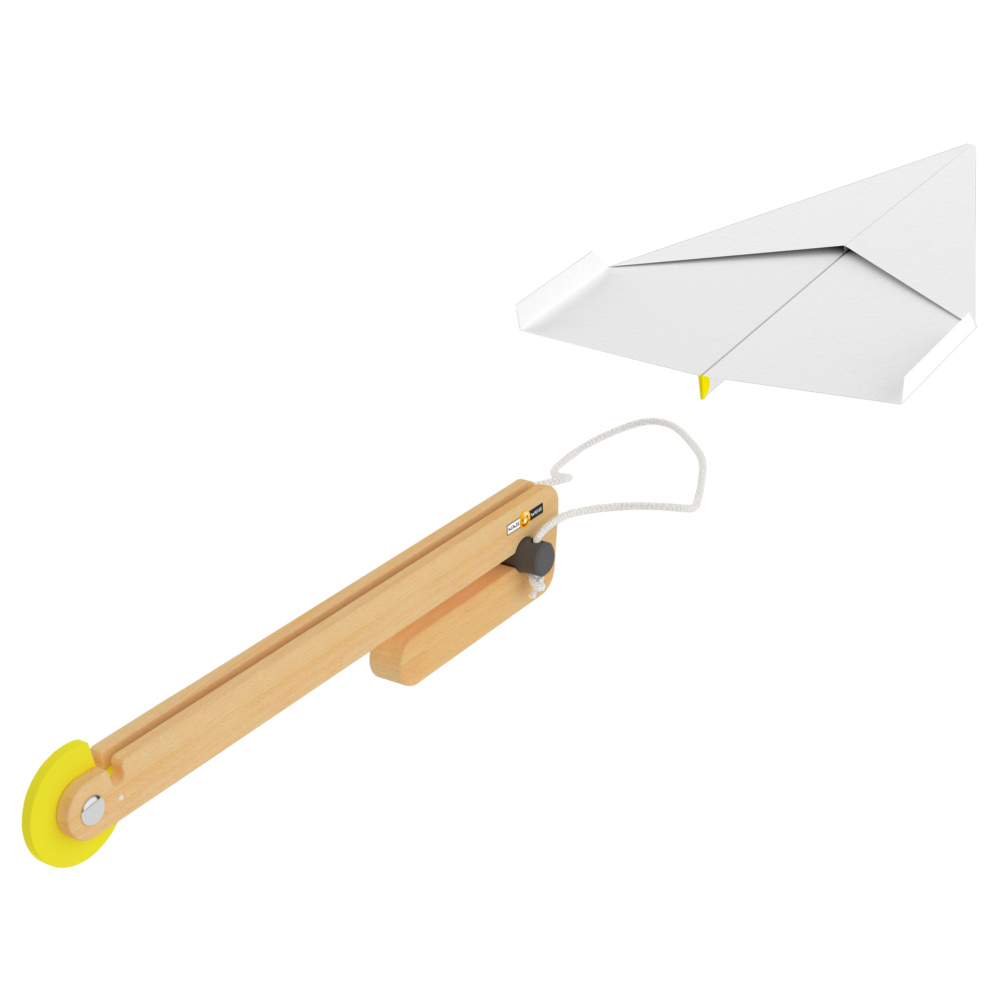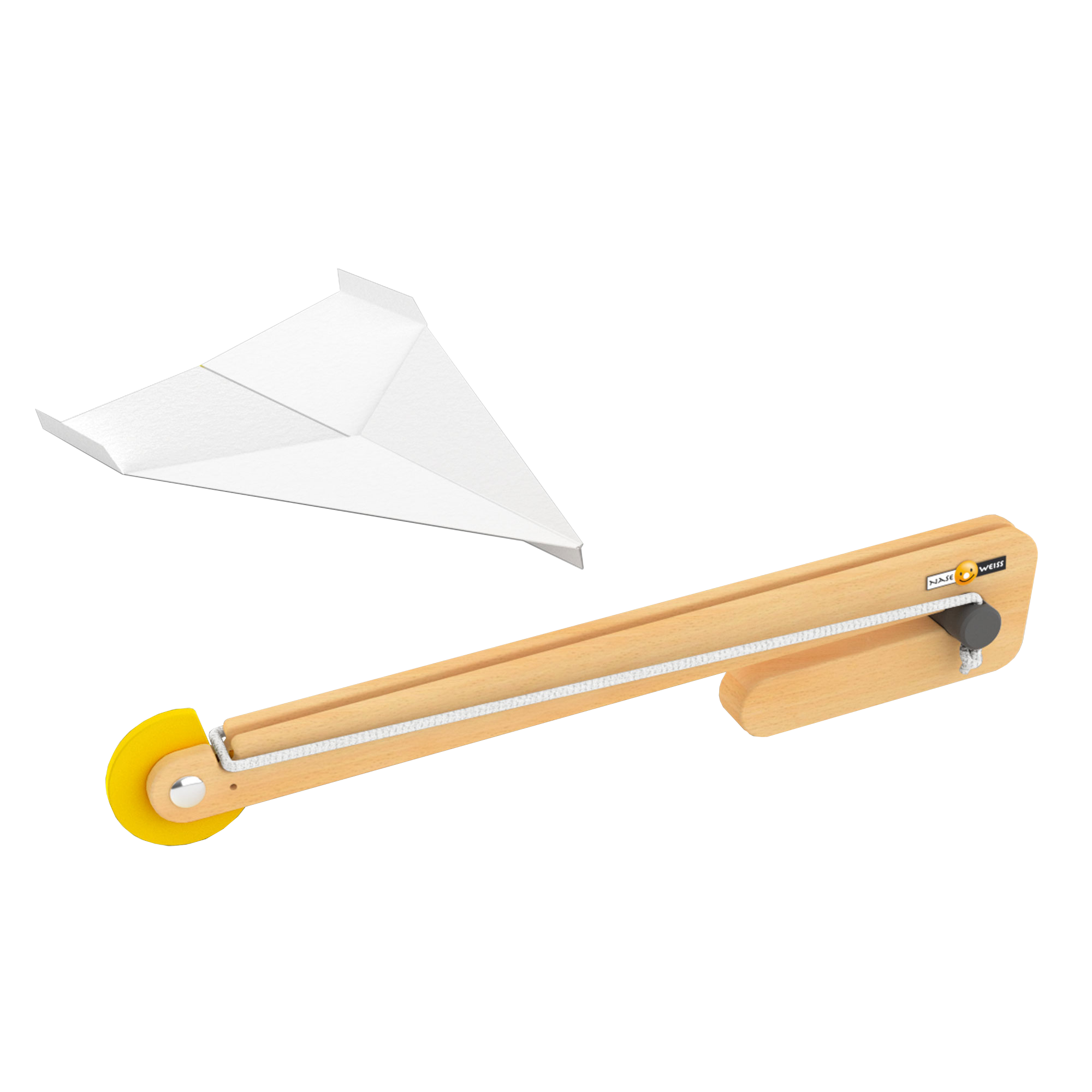 Lege deinen gefalteten Papierflieger in der Spalt der Abflugrampe. Schiebe ihn nach hinten, bis er an der Gummischnur anliegt. - NASEWEISS Überflieger starten: