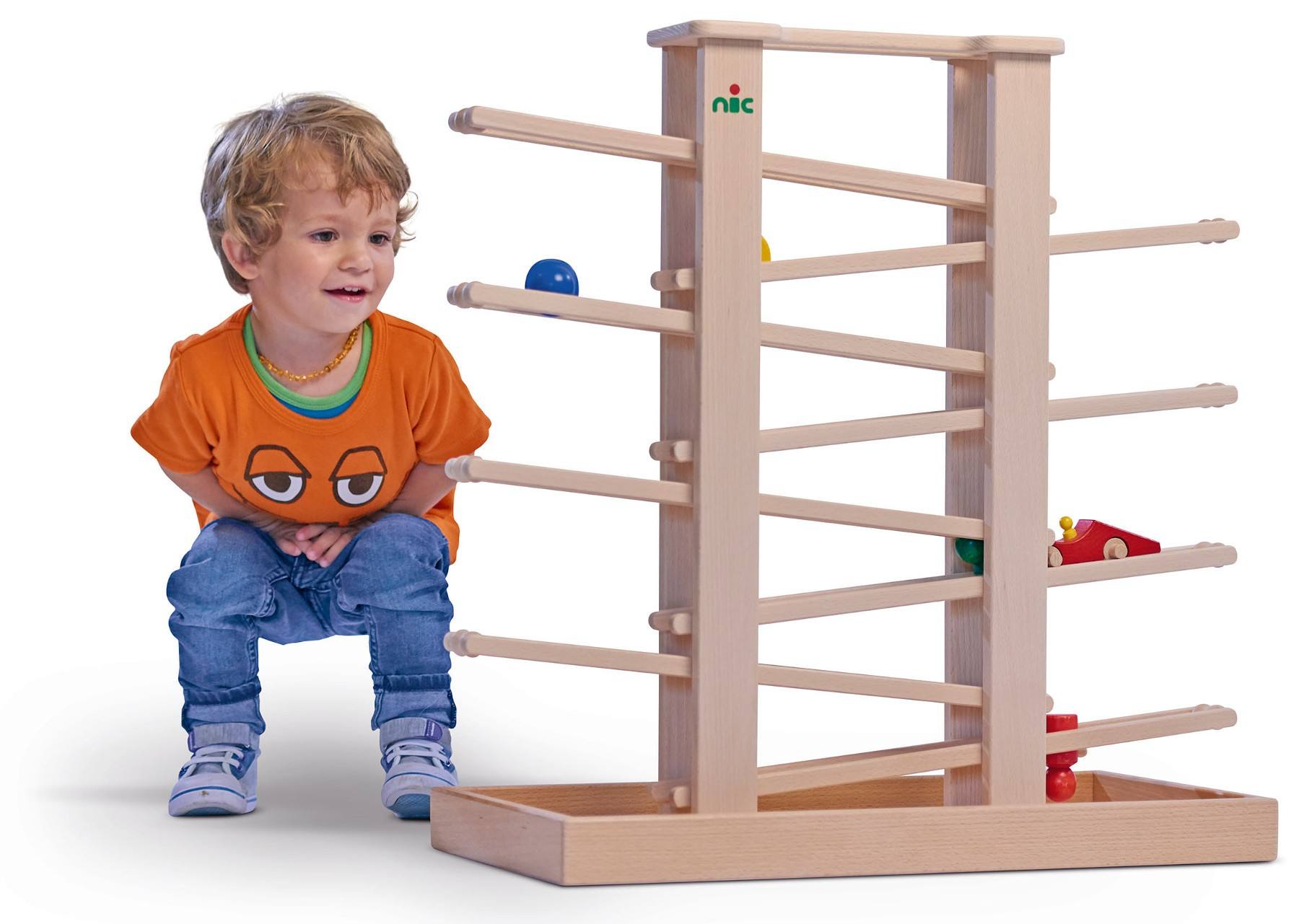 Die Multibahn von nic ist in unterschiedlichen Größen und Ausführungen erhältlich und erfüllt dabei fast jeden Wunsch. Sie werden mit jeder weiteren Laufbahn noch wertvoller. Die vielen phantastischen Laufteile eignen sich dabei für alle nic-Bahnen gleichermaßen. Die Modelle der Duo-Serie verfügen dabei über gleich 2 Laufbahnen. Auf diesen beiden Laufspuren entstehen die spannendsten Rennen. Die Bahnen laden auch zum gemeinsamen Spielen ein. Wer ist bei der Duo-Serie der erste im Ziel. Die nic Modelle mit Auffangschale haben sich als besonders standfest erwiesen und bieten gleichzeitig mit der Schale praktischen Raum zur Aufbewahrung der Laufteile. Das geringe Gefälle der nic-Laufbahnen führt zu einer optimalen Laufgeschwindigkeit. Daraus ergeben sich tolle Erlebnisse für das Kinderauge besonders bei den Scheiben. Ein gelegentliche Stoppen von Laufteilen oder das Auftreten von Karambolagen erhöht den Spielreiz und führt zu noch aktiverem Spielen.