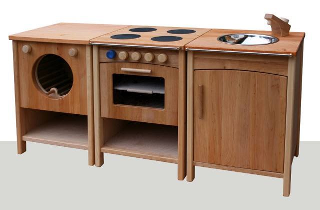 Es handelt sich bei dieser Schöllner Kinderspüle um ein Modell mit natur Leisten. Die Kinderspüle kommt mit Edelstahl-Waschbecken und Kühlschrank mit Eierfach. Die Tür und die Platte sind aus geölter, massiver Erle. Auf ihren Füßen ist diese Spüle 50 cm hoch.