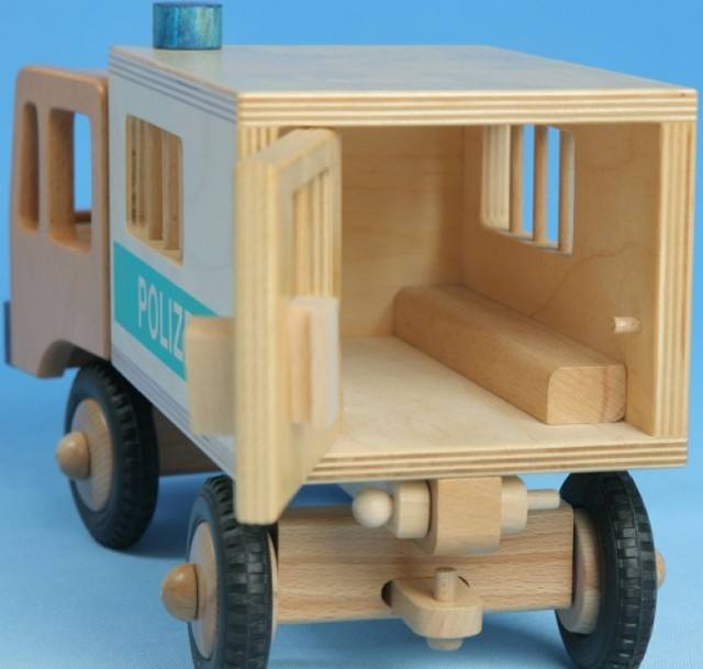 Es handelt sich um einen Polizei-LKW aus Holz mit lebensmittelechter Vollgummibereifung. Die Fenster des Aufsatzes sind vergittert. Außerdem hat dieser eine Tür. Die Lenkung erfolgt über das drehbar montierte Fahrerhaus.