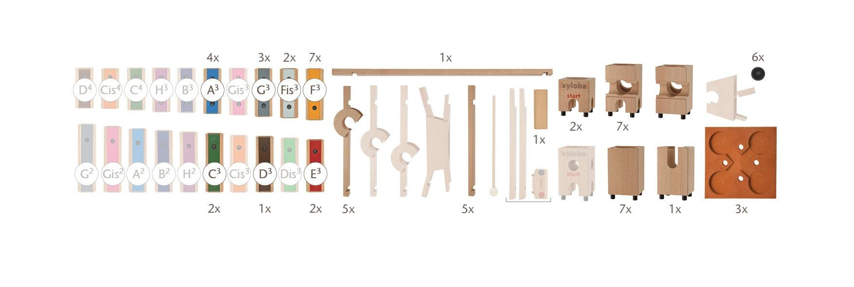 Der Xyloba Kugelbahn Melodienkasten Kindergarten ist ein Set der Xyloba Kugelbahn. Dieses ermöglicht es die Anfänge von 4 Melodien mit der Xyloba Kugelbahn zu bauen.