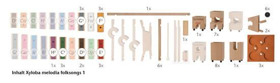 Der Xyloba Kugelbahn Melodienkasten Melodia Folksongs 1 ist ein Set der Xyloba Kugelbahn. Dieses ermöglicht es die Anfänge der folgenden 4 Melodien mit der Xyloba Kugelbahn zu bauen.