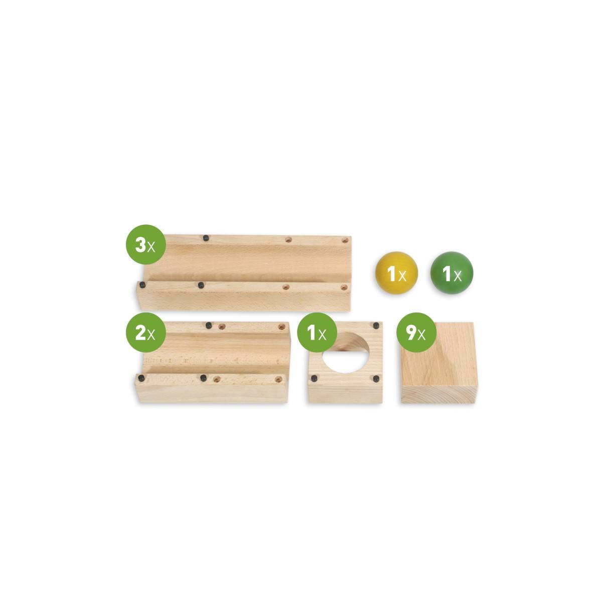 Lieferumfang des Xyloba Junior Mini: 3 x Rollbahn lang, 2 x Rollbahn kurz, 1 x Startklotz, 9 x Bauklotz, 2 x Kugel - 15 Teile.